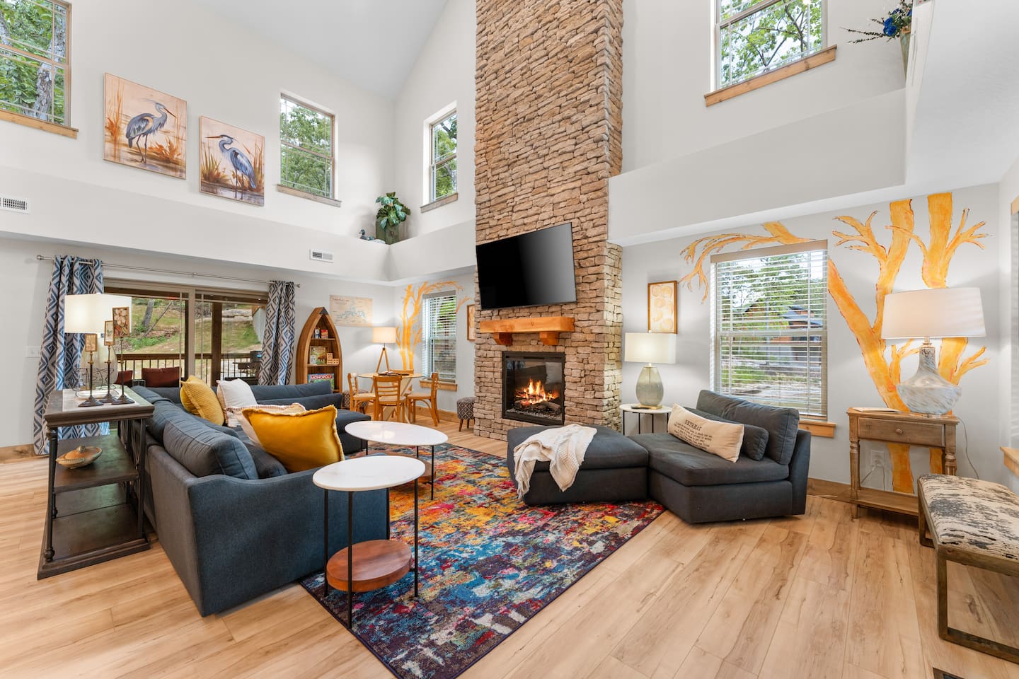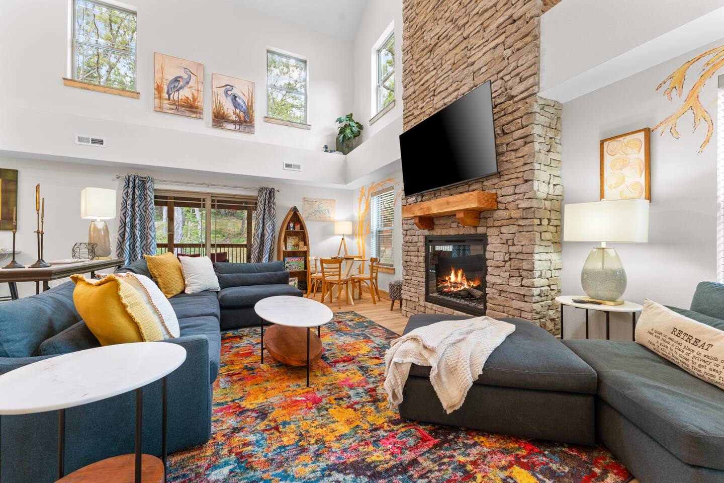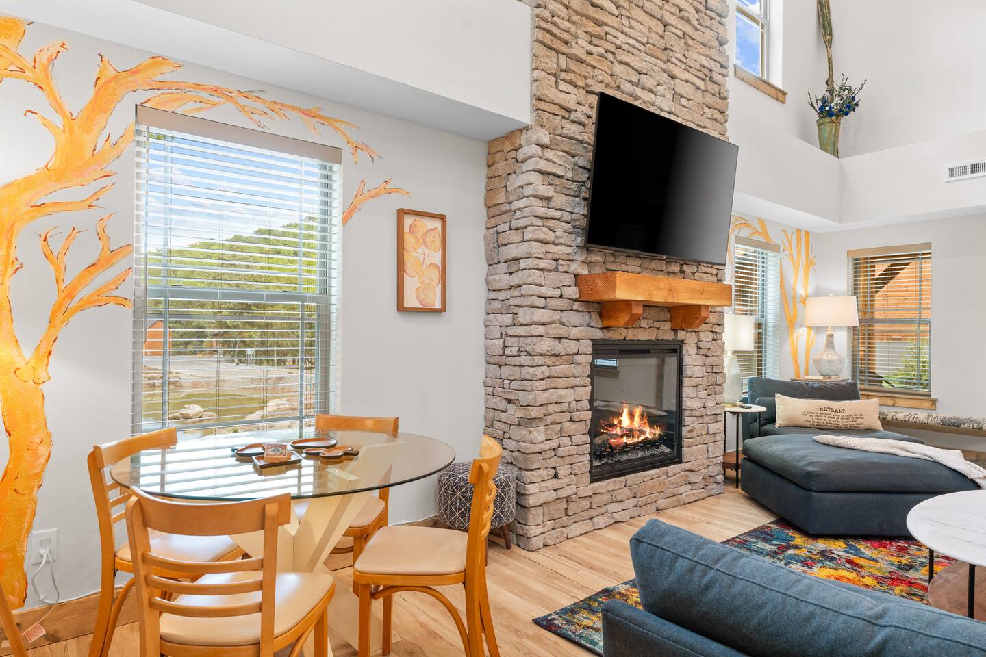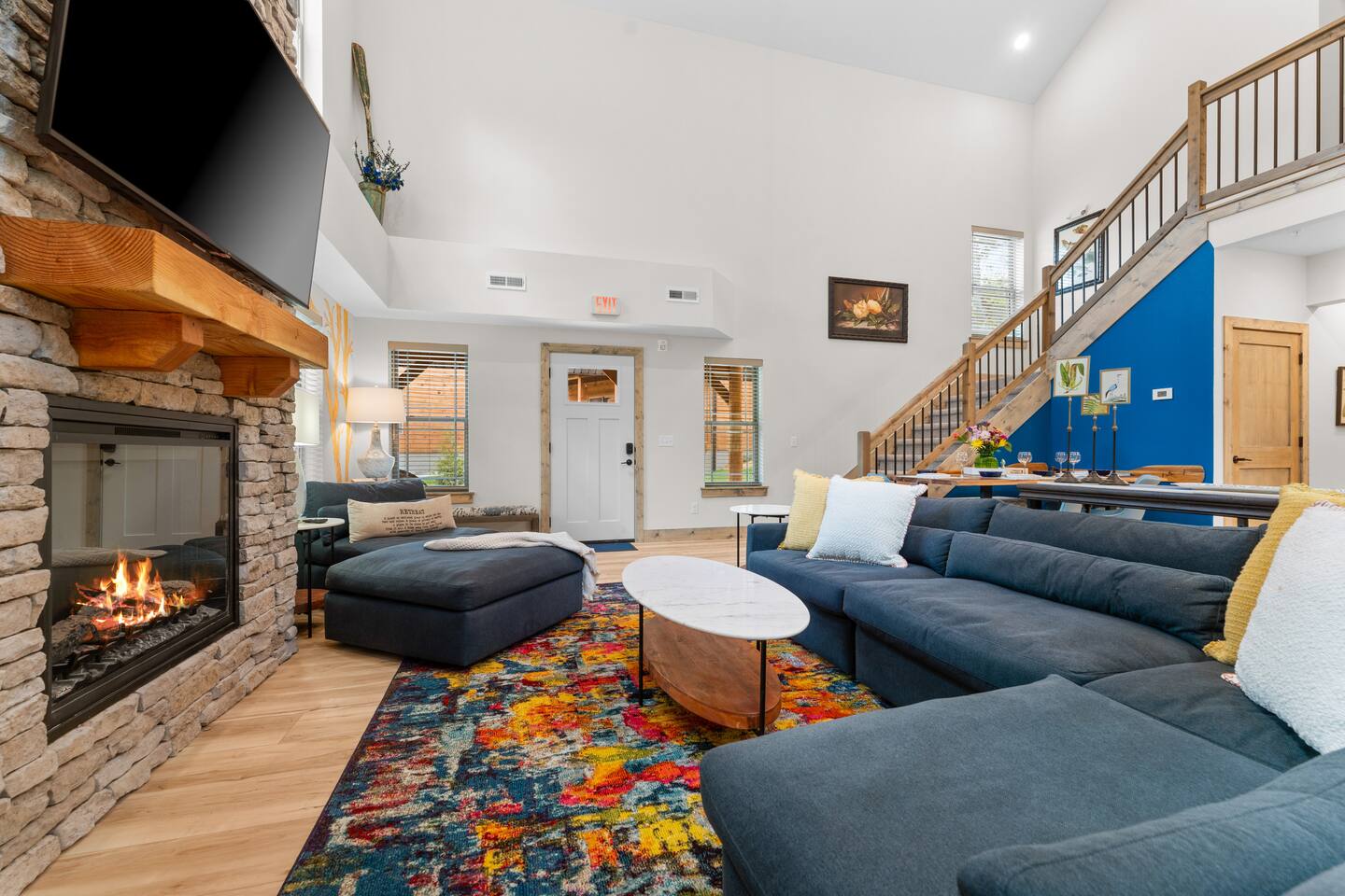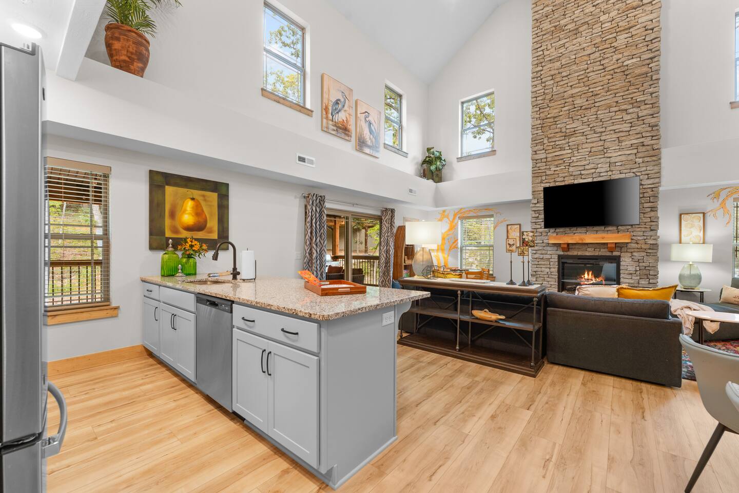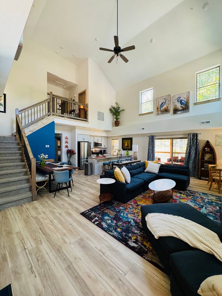 Main Level: Enjoy two spacious king-size master bedrooms, each with its own en-suite bathroom. The open-concept kitchen, dining, and living area features high vaulted ceilings and a cozy fireplace, perfect for relaxing or entertaining. Step outside to the main-level patio, fully furnished and equipped with a grill — ideal for outdoor cooking and dining. Upper Level: Upstairs includes a queen bedroom with an en-suite full bathroom, offering beautiful Timber Woods views right from the window. A kids’ bedroom features two twin beds and one full bed, providing a fun and cozy space for little ones.