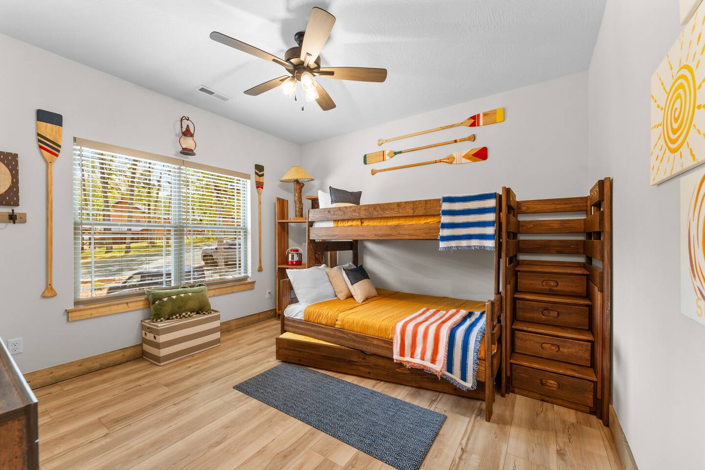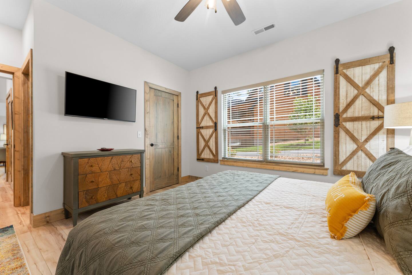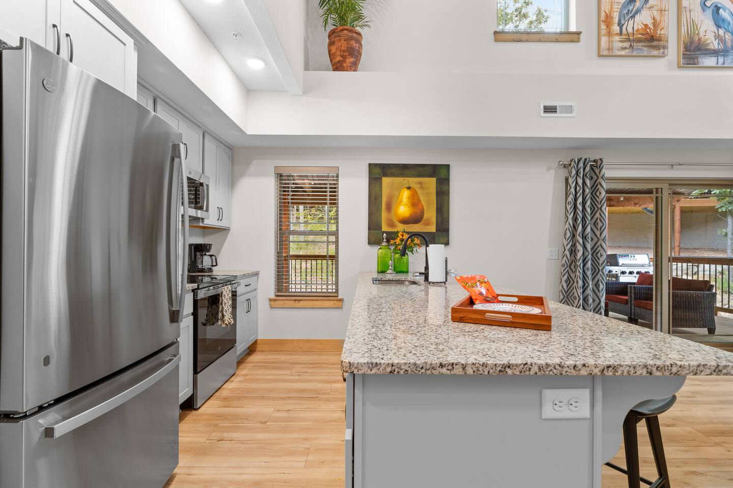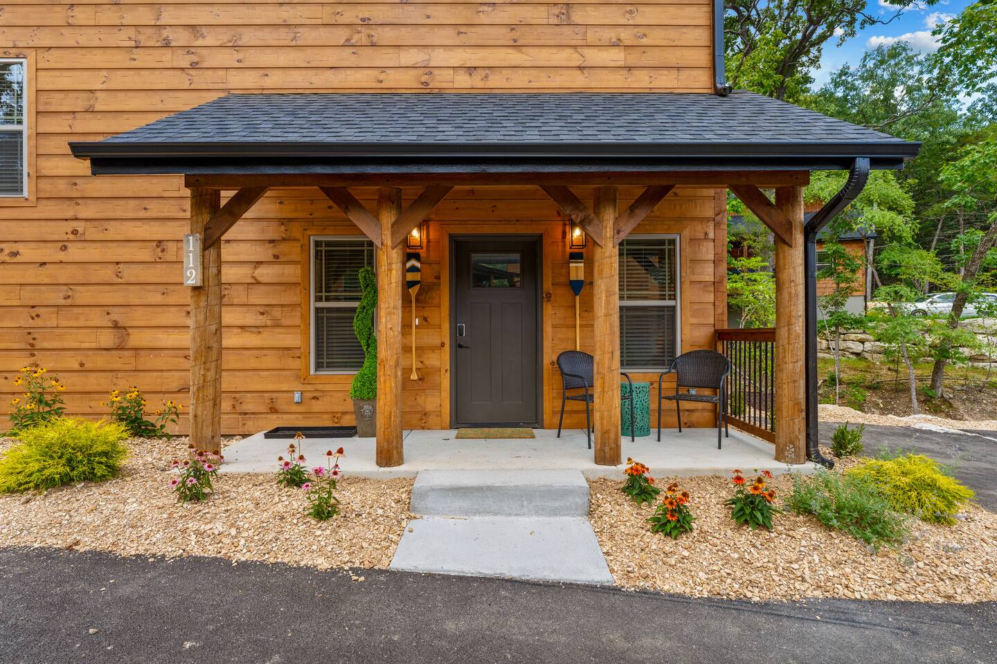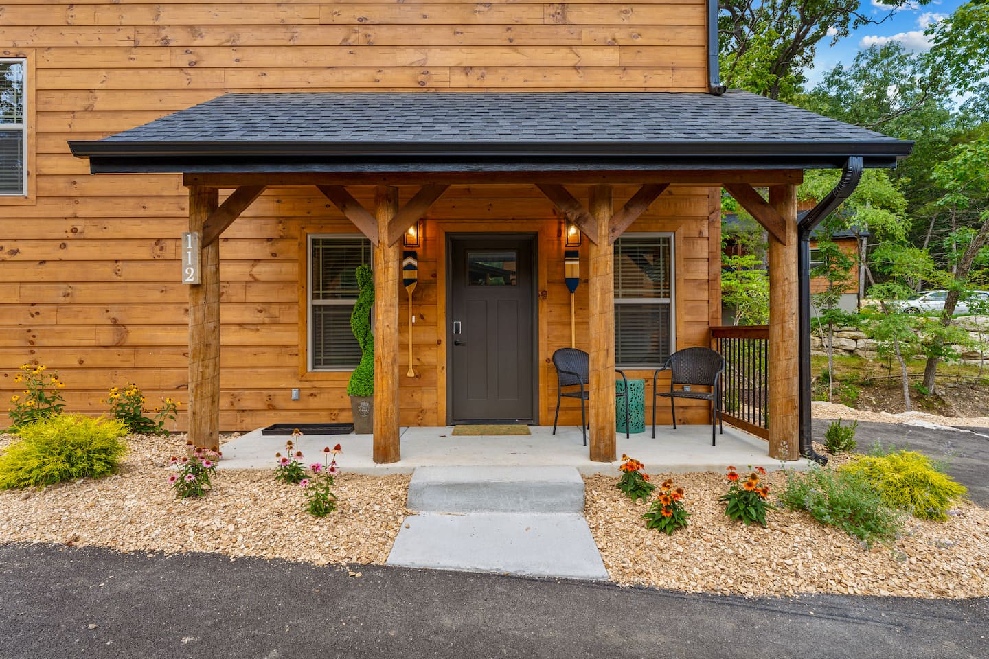 Main Level: Enjoy two spacious king-size master bedrooms, each with its own en-suite bathroom. The open-concept kitchen, dining, and living area features high vaulted ceilings and a cozy fireplace, perfect for relaxing or entertaining. Step outside to the main-level patio, fully furnished and equipped with a grill — ideal for outdoor cooking and dining. Upper Level: Upstairs includes a queen bedroom with an en-suite full bathroom, offering beautiful Timber Woods views right from the window. A kids’ bedroom features two twin beds and one full bed, providing a fun and cozy space for little ones.