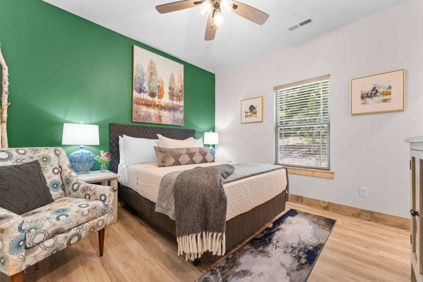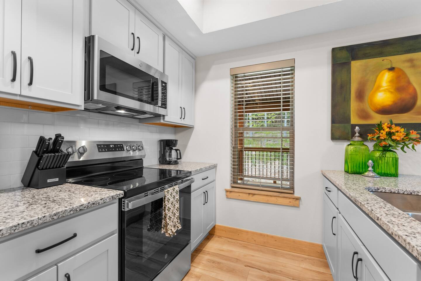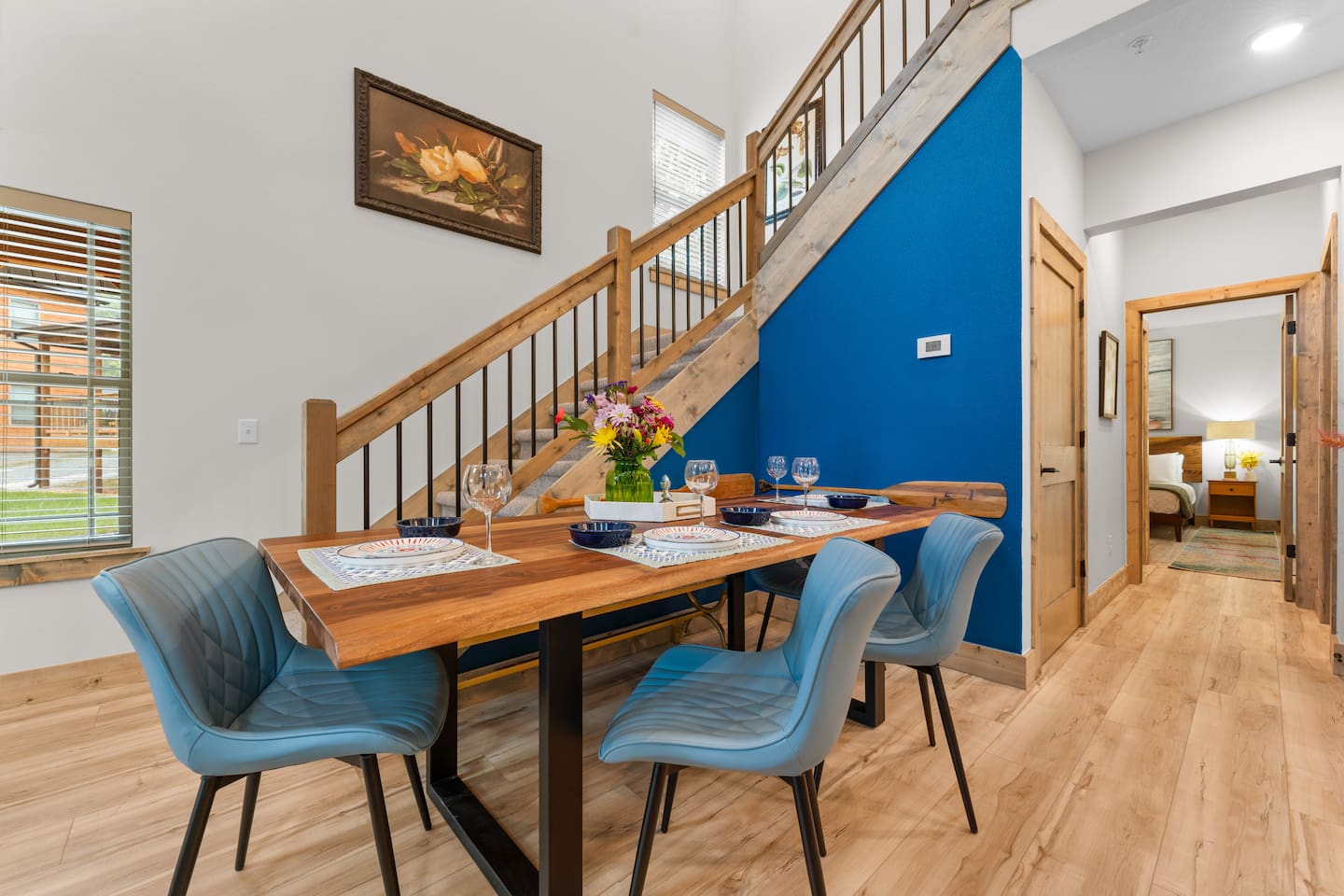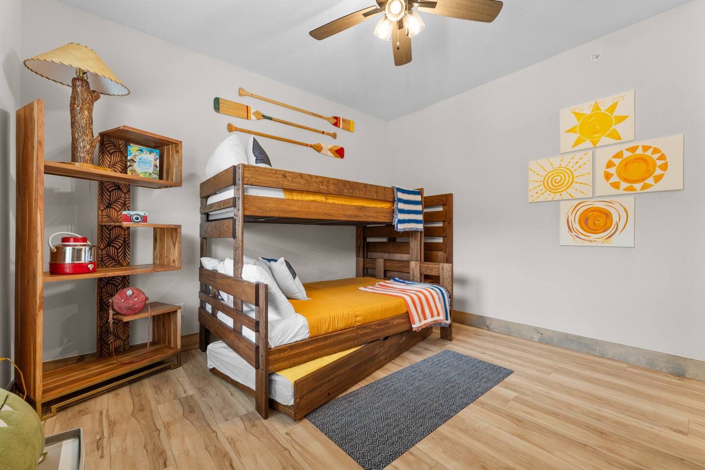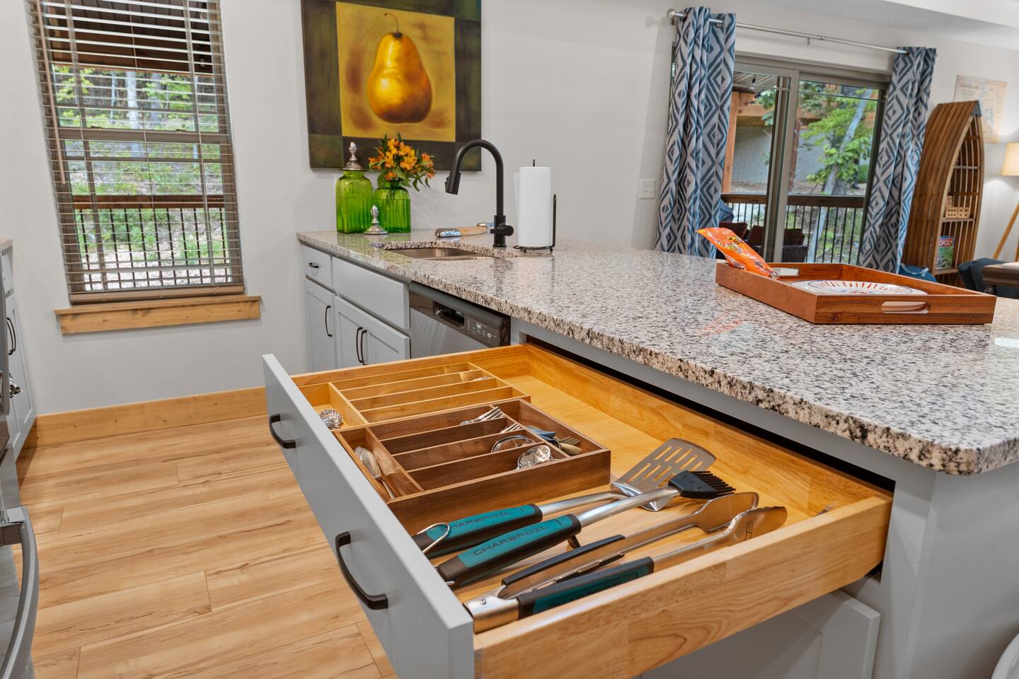 Main Level: Enjoy two spacious king-size master bedrooms, each with its own en-suite bathroom. The open-concept kitchen, dining, and living area features high vaulted ceilings and a cozy fireplace, perfect for relaxing or entertaining. Step outside to the main-level patio, fully furnished and equipped with a grill — ideal for outdoor cooking and dining. Upper Level: Upstairs includes a queen bedroom with an en-suite full bathroom, offering beautiful Timber Woods views right from the window. A kids’ bedroom features two twin beds and one full bed, providing a fun and cozy space for little ones.