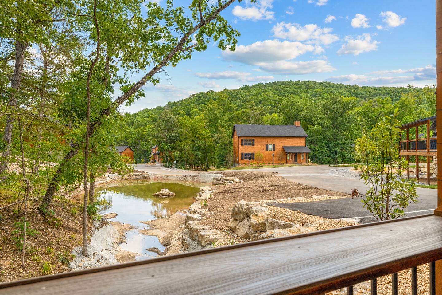 Make some memories at this unique and family-friendly place. Escape to Tall Timber Camp! This spacious 4-bedroom,4-bath retreat offers the perfect blend of comfort and nature, nested beside a creek with peaceful pond views. Enjoy morning coffee on the deck while watching the peaceful creek and pond View. offers a variety of indoor and outdoor activities for familes and groups, including swimming pools, fishing, hiking, live music with food truck during summer nights and basketball/pickleball ct